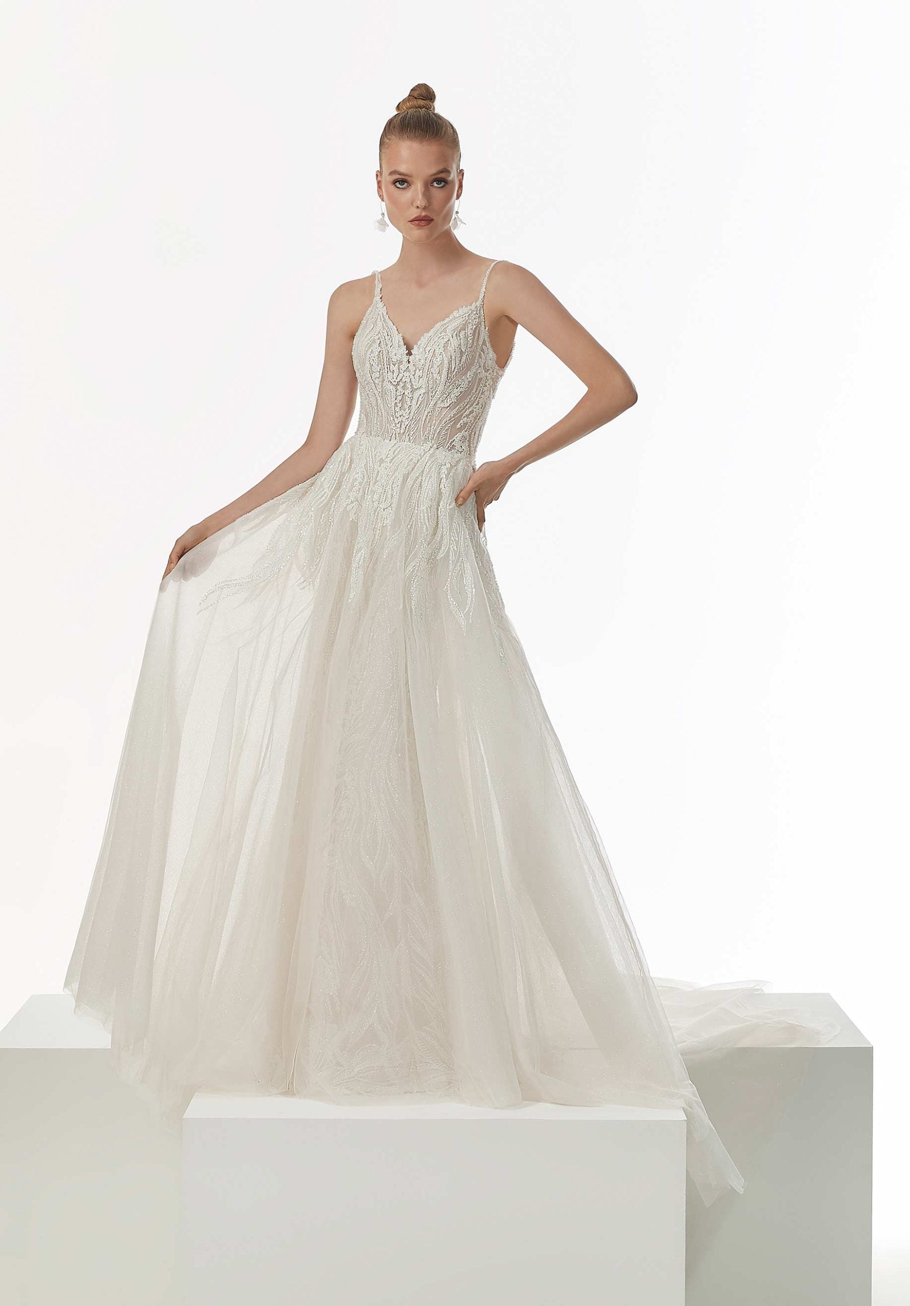 Our Narcissa designer wedding dress features allover beaded embroidery in an intricate pattern that creates a subtle, yet striking, effect and draws the eye down the body. The fit and flare silhouette hugs your curves, in dimensional sparkle net, with a classic v-neckline and matching v-back. The detachable full sparkle tulle overskirt changes the silhouette creating an elegant A-line shape giving you two looks in one. Shown in Ivory/Champagne/Honey.