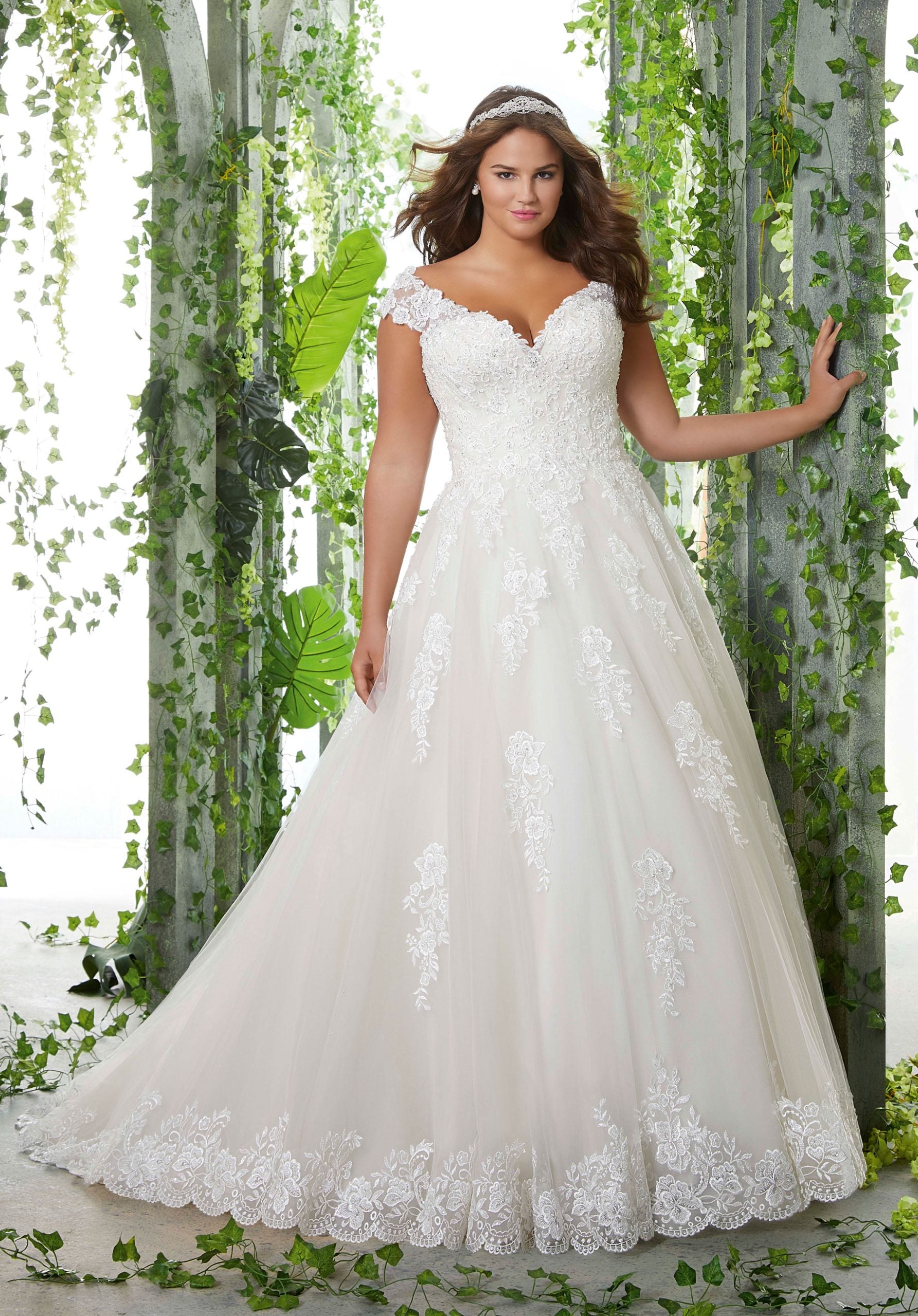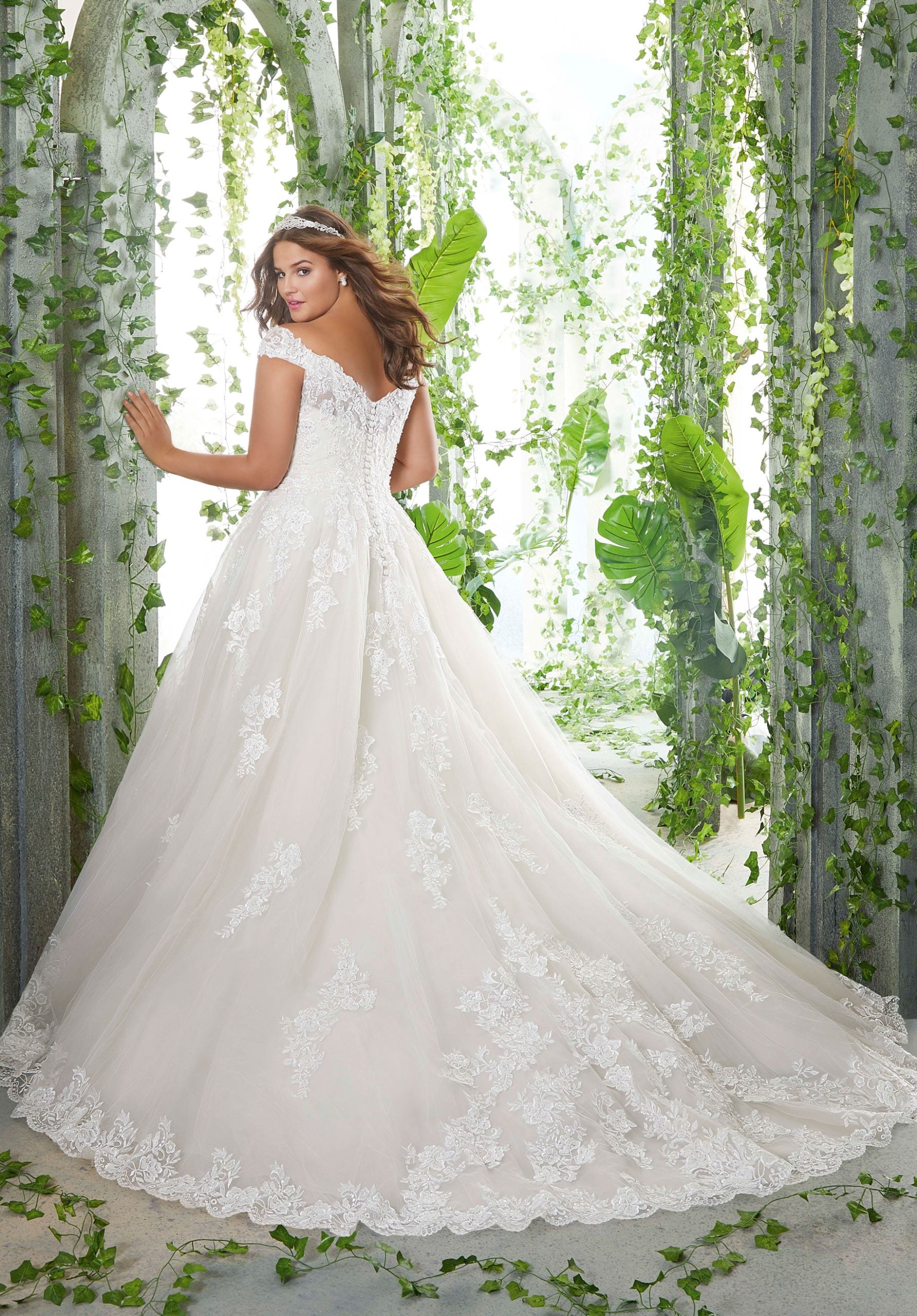 Crystal Beaded, Frosted, Embroidered Lace Appliqués on a Tulle Ballgown with Wide Scalloped Hemline. Available in Three Lengths: 55″, 58″, 61″. Shown in Ivory/Champagne.