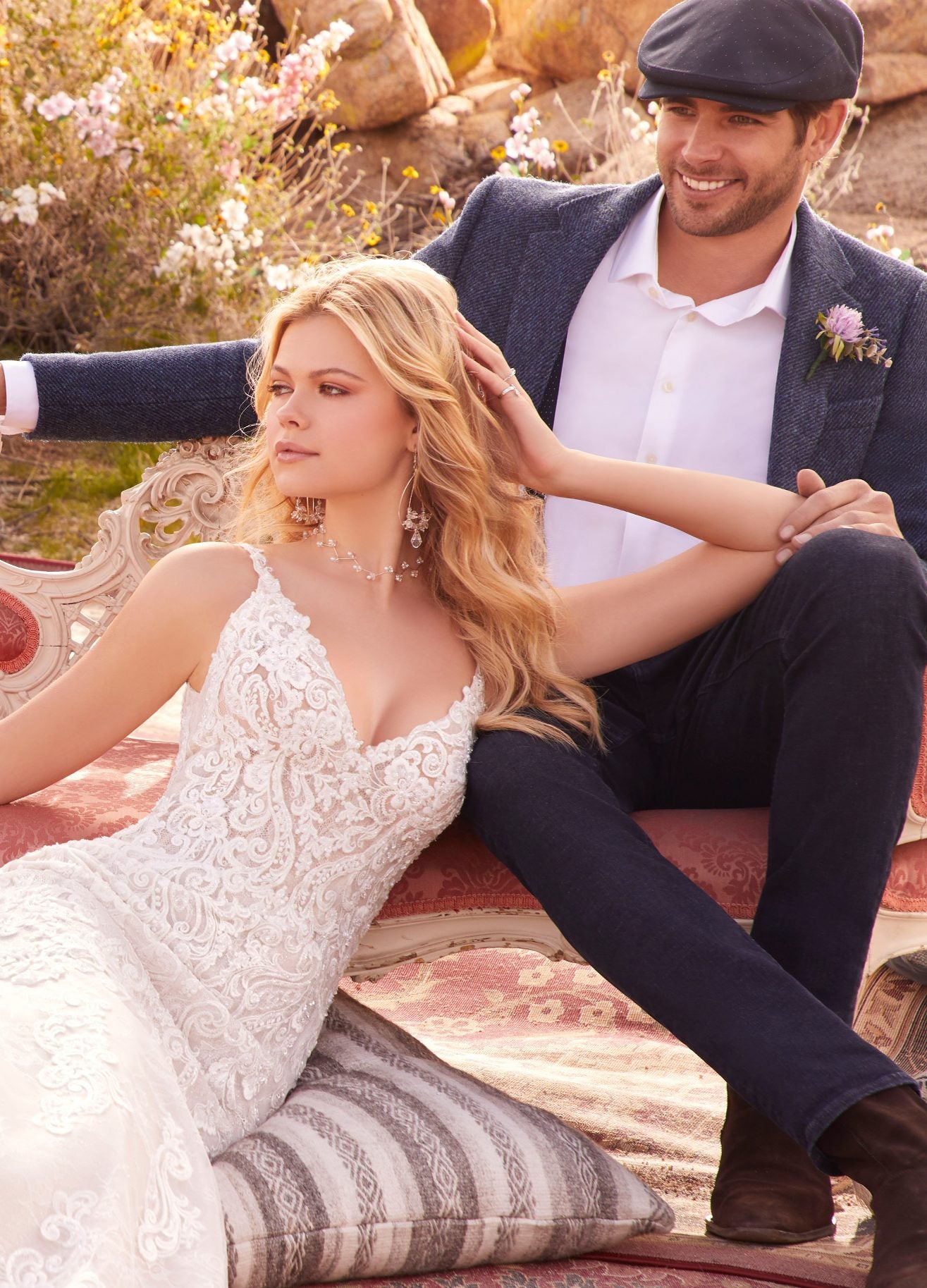 Shown in ivory/rose/nude, this sleeveless Renee designer wedding dress features crystal beaded, venice lace appliqués on an allover chantilly lace mermaid gown with a scalloped hemline. Available in ivory/ivory and ivory/rose/nude, the v-neckline complements the mermaid silhouette of this designer wedding dress. The buttons along the back of the dress complete the look. This wedding dress is available in three lengths: 55″, 58″, 61″. The full front bodice lining is available as style #2093l. Shown in ivory/rose/nude.