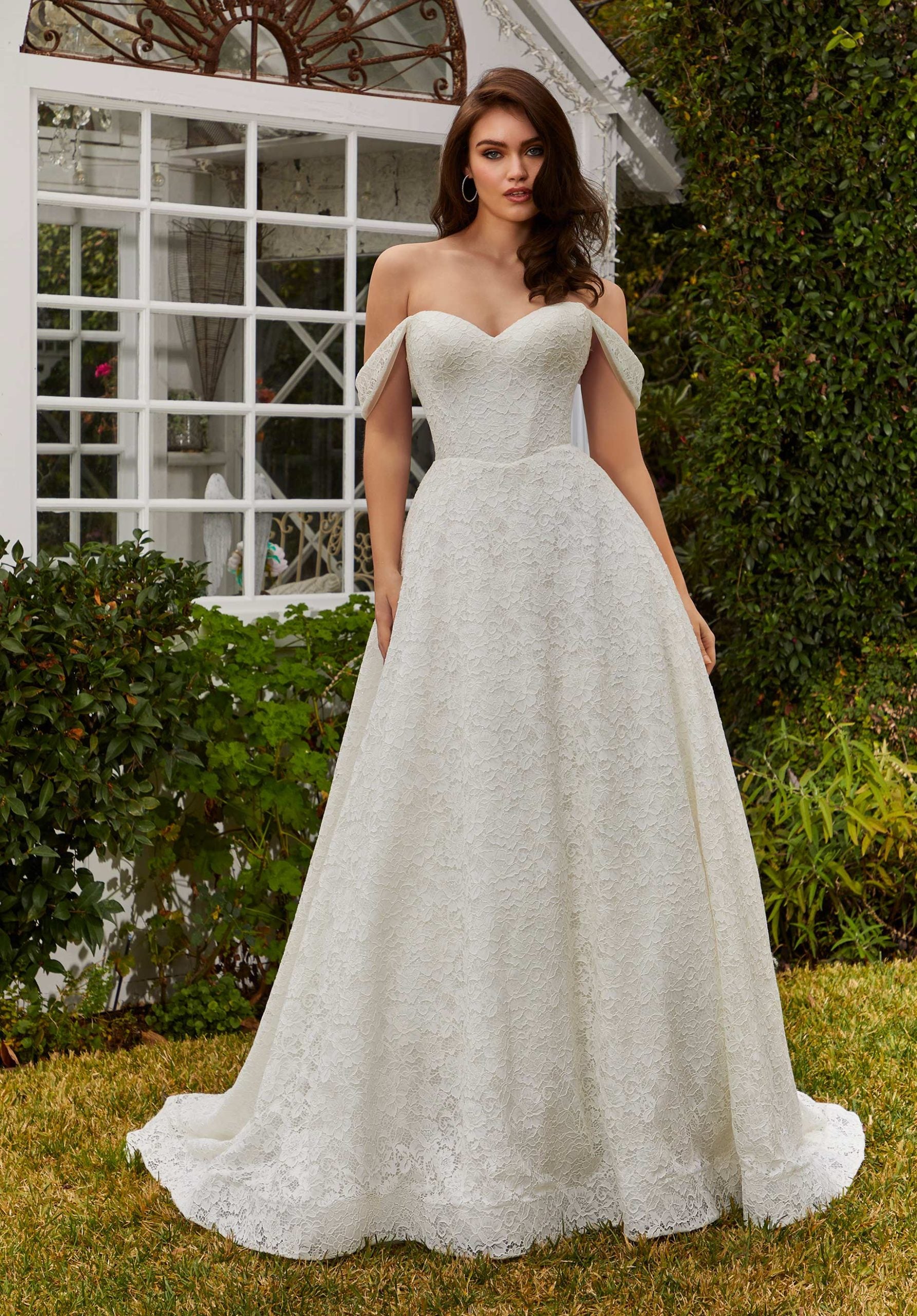 Dainty and delicate, our River designer wedding dress stuns in allover Alençon lace that has an intricate floral motif. Classic details like the strapless sweetheart neckline and soft basque waist make the dress easy to love, but out favorite back is the sheer back framed by the romantic lace with corset boning. Sparkle tulle fabric ensures you’ll shimmer all night long, while detachable off-the-shoulder sleeves let you switch up your look. Shown in Ivory/Honey and Ivory/Bluebell/Honey.