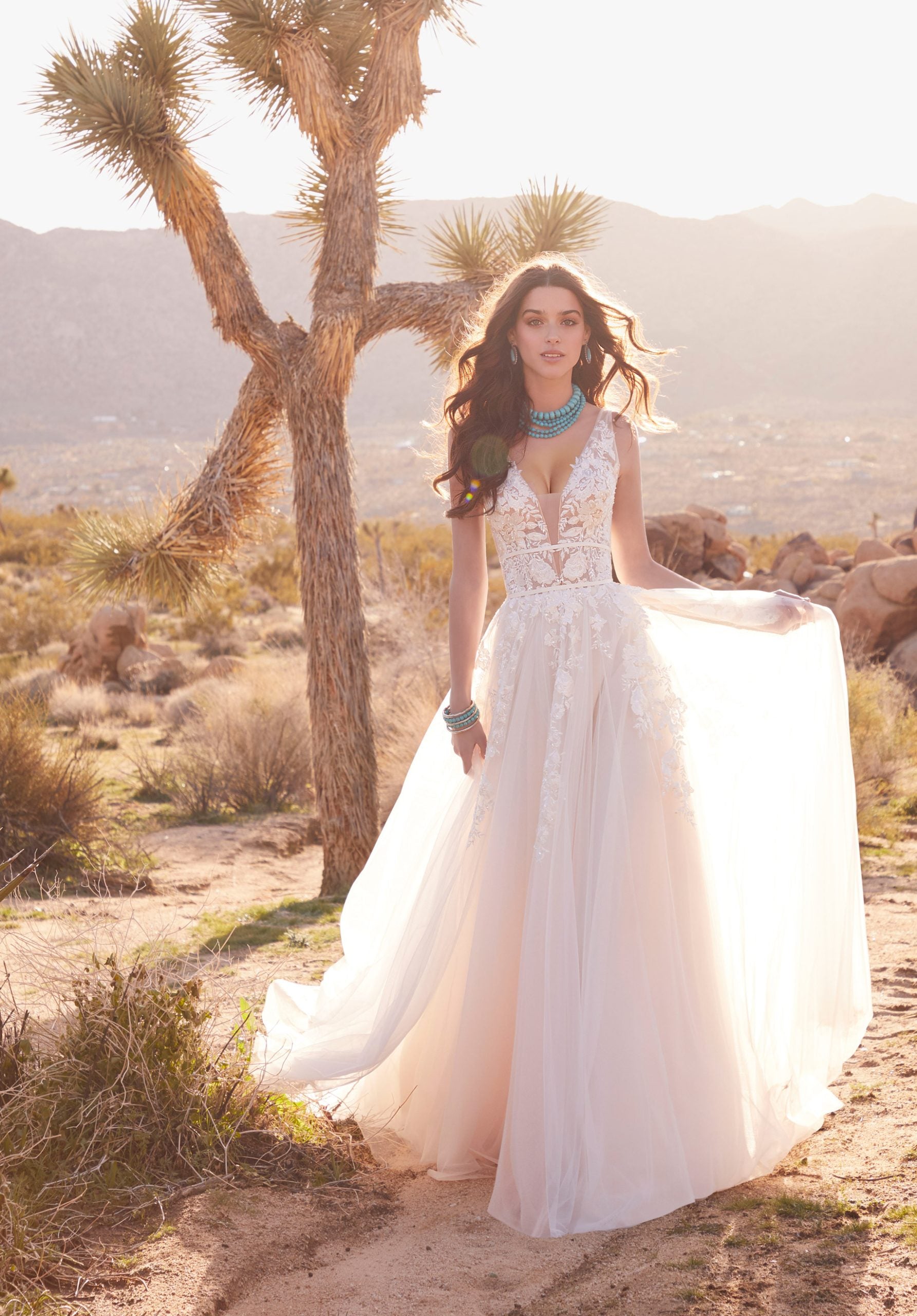 The Rosa designer wedding dress features a v-neckline with an A-line silhouette. This bridal gown features stunning crystals, embroidery, appliqués, and beading to highlight the bridal design. The buttons along the back complete the look of this designer wedding dress. Shown in Ivory/Champagne.