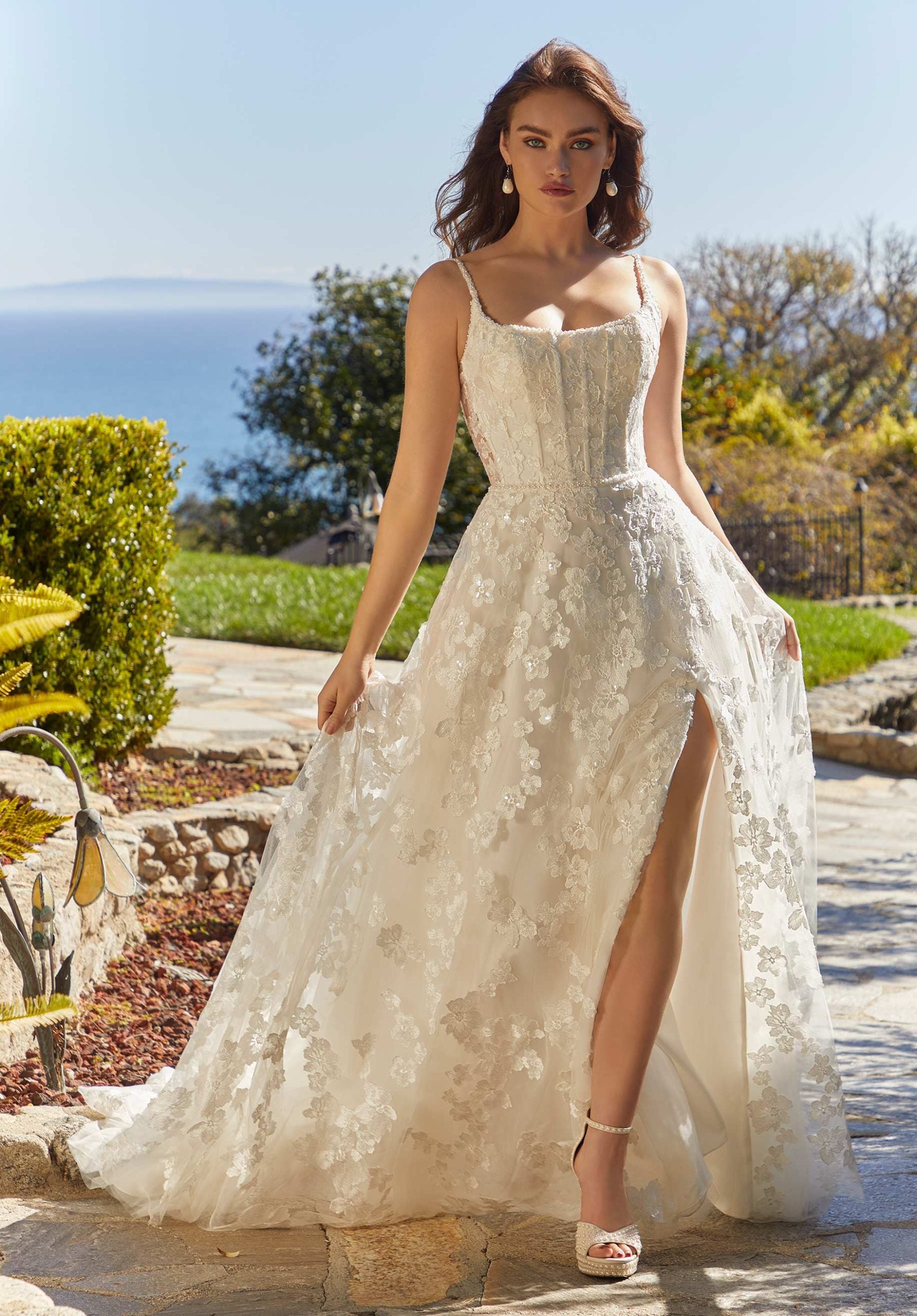 Our Ruth designer wedding dress is the definition of flower power. The airy A-line features allover frosted floral embroidery for a beautiful, botanical look. The corset bodice adds structure to the soft gown, with shimmering pearl and crystal beaded trim accenting the square neckline and waist. The sheer back highlights the couture boning while the front skirt slit add more movement to the gown. Shown in Ivory/Porcelain.