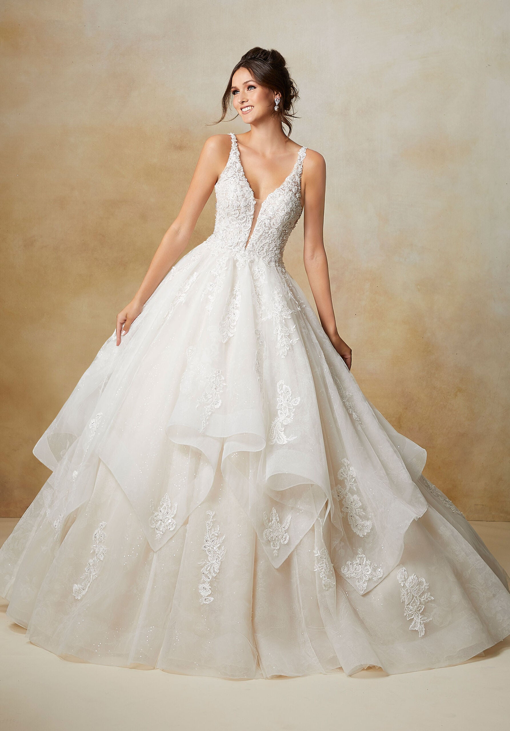 The UNK-Sage wedding dress, from the Signature Collection by Madeline Gardner, is an exquisite ball gown silhouette crafted from delicate tulle. Featuring a flattering V-neckline and natural waist, this floor-length gown is available in Ivory/Champagne or Ivory/Ivory. Choose from sleeveless or strap options. Available in sizes 000 to 24. Price range $2000-$6500 USD.