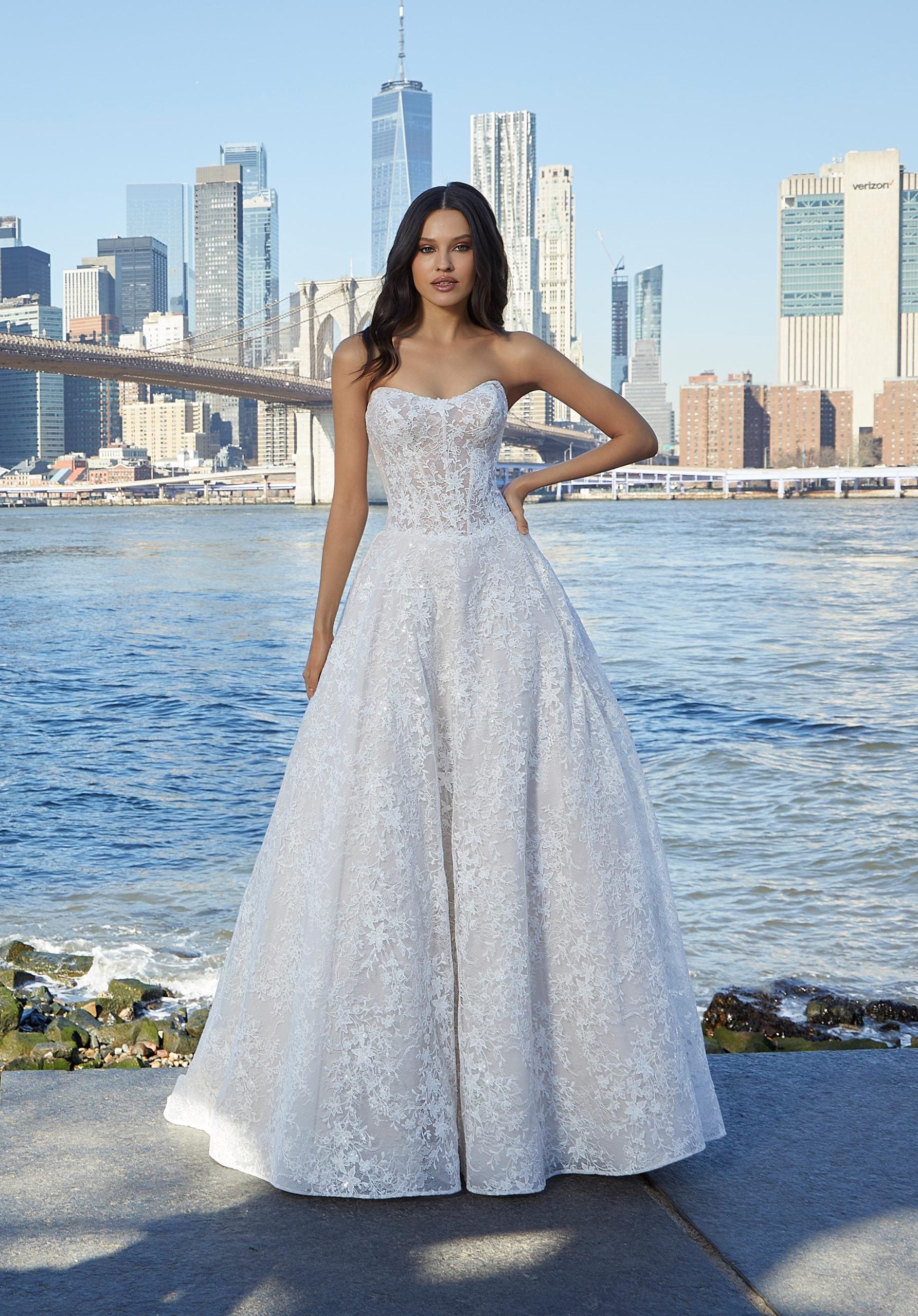 Our Sansa designer wedding dress is all about luxe layers. Frosted embroidery has an intricate floral pattern over romantic Chantilly lace creating a dimensional look with its layered detailing. The gown has a chic strapless neckline on a structured corset bodice and a basque waist, drawing the eye down and in, to create an hourglass silhouette when paired with the A-line skirt. Buttons down to the hemline are the perfect finishing touch to the dress. Shown in Ivory/Champagne/Honey.