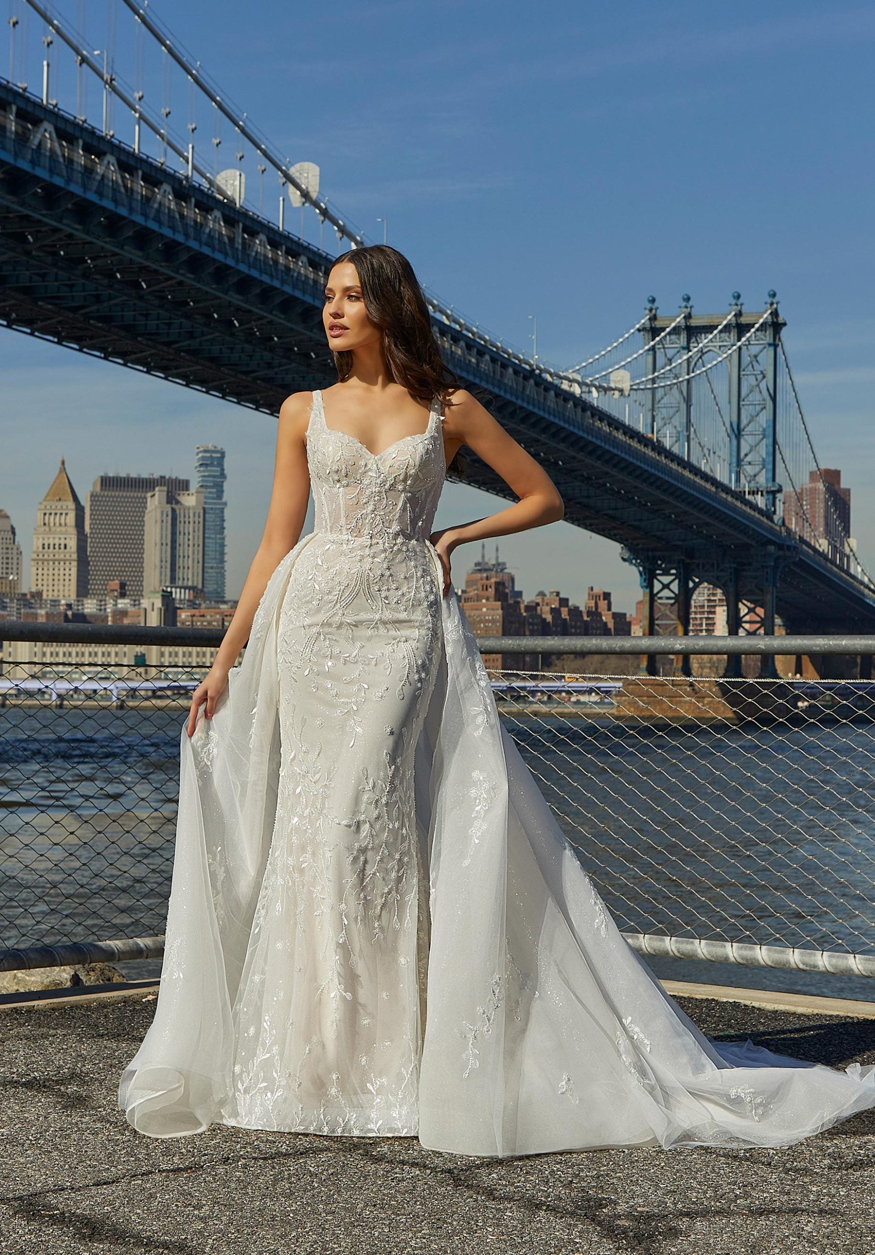 Sultry and sophisticated, our Selma designer wedding dress is a stunning fit and flare the hugs your curves giving you and hourglass silhouette. Intricately beaded embroidered has a beautiful botanical design over sparkle tulle, giving you a dimensional shimmer. The corset bodice offers structure and shape with a shapely sweetheart, v-neckline and straps that lead to a simple square back. For added drama pair the dress with the detachable train, designed with matching embroidery. Shown in Ivory/Champagne/Honey.