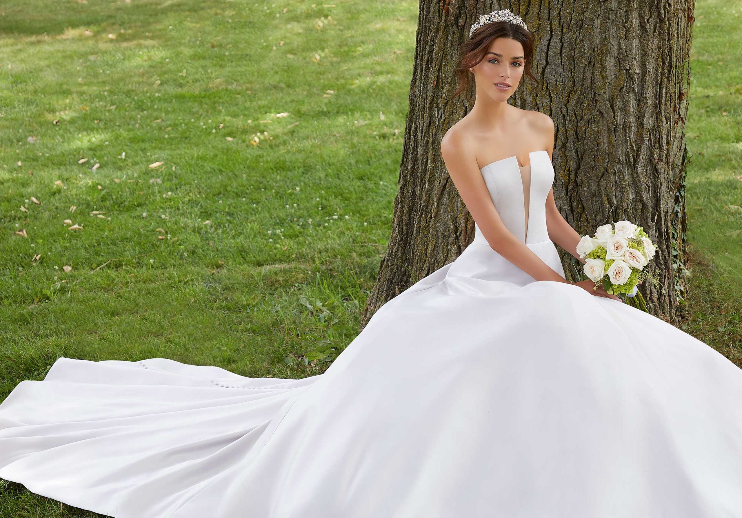 The Shelby is a modern satin A-line wedding gown featuring a straight strapless neckline with a sultry plunging net inset and the fun addition of pockets. Available in three lengths: 55″, 58″, 61″. Shown in Smoky Lavender.