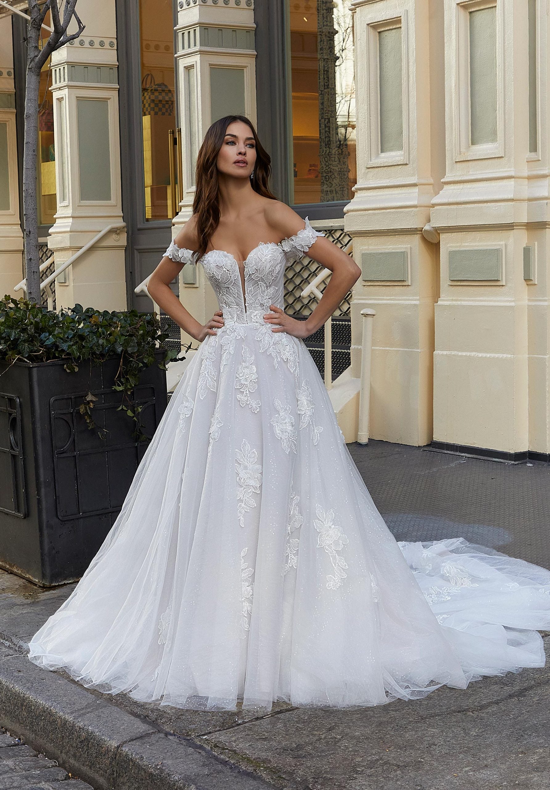 Our Sophia designer wedding is making bridal dreams come true. The breathtaking ball gown has a plunging bodice with a sweetheart neckline and textured ruching. Frosted, floral embroidered three-dimensional appliqués decorate the bodice and cascade down the sparkling frosted tulle A-line skirt. Detachable off-the-shoulder sleeves feature matching appliqués and give you versatility in styling the dress. Shown in Ivory/Smoky Lavender/Honey.