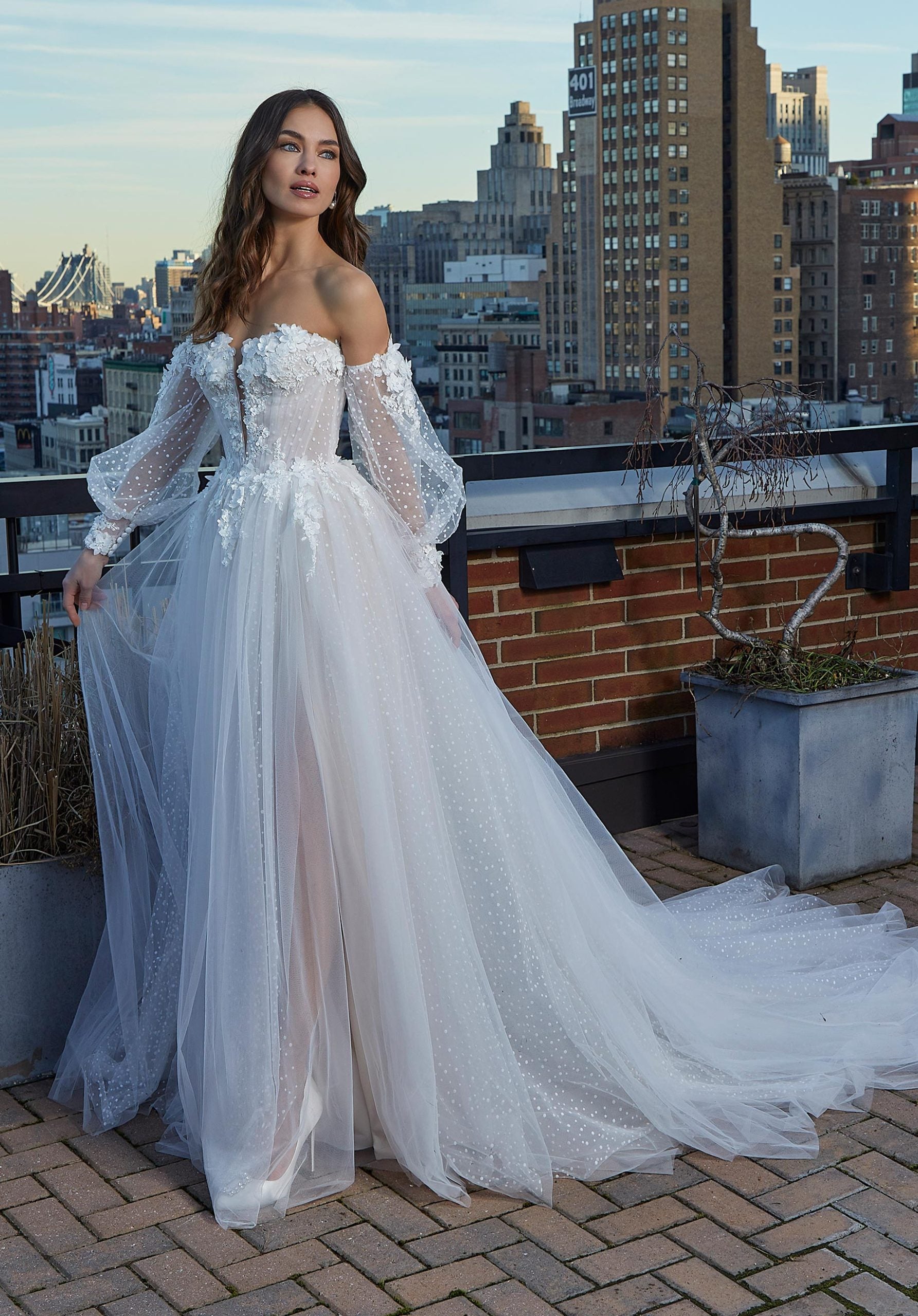 Our Starla designer wedding dress is full of whimsy and wonder. The gown features a plunging neckline on a delicately pleated bodice designed with three-dimensional floral embroidery and crystal beading. Unique swiss dot fabric is overlayed with gossamer tulle, with a playful underskirt slit, for an ethereal look with matching detachable bishop sleeves to add to the whimsical gown. Shown in Ivory/Champagne/Honey.
