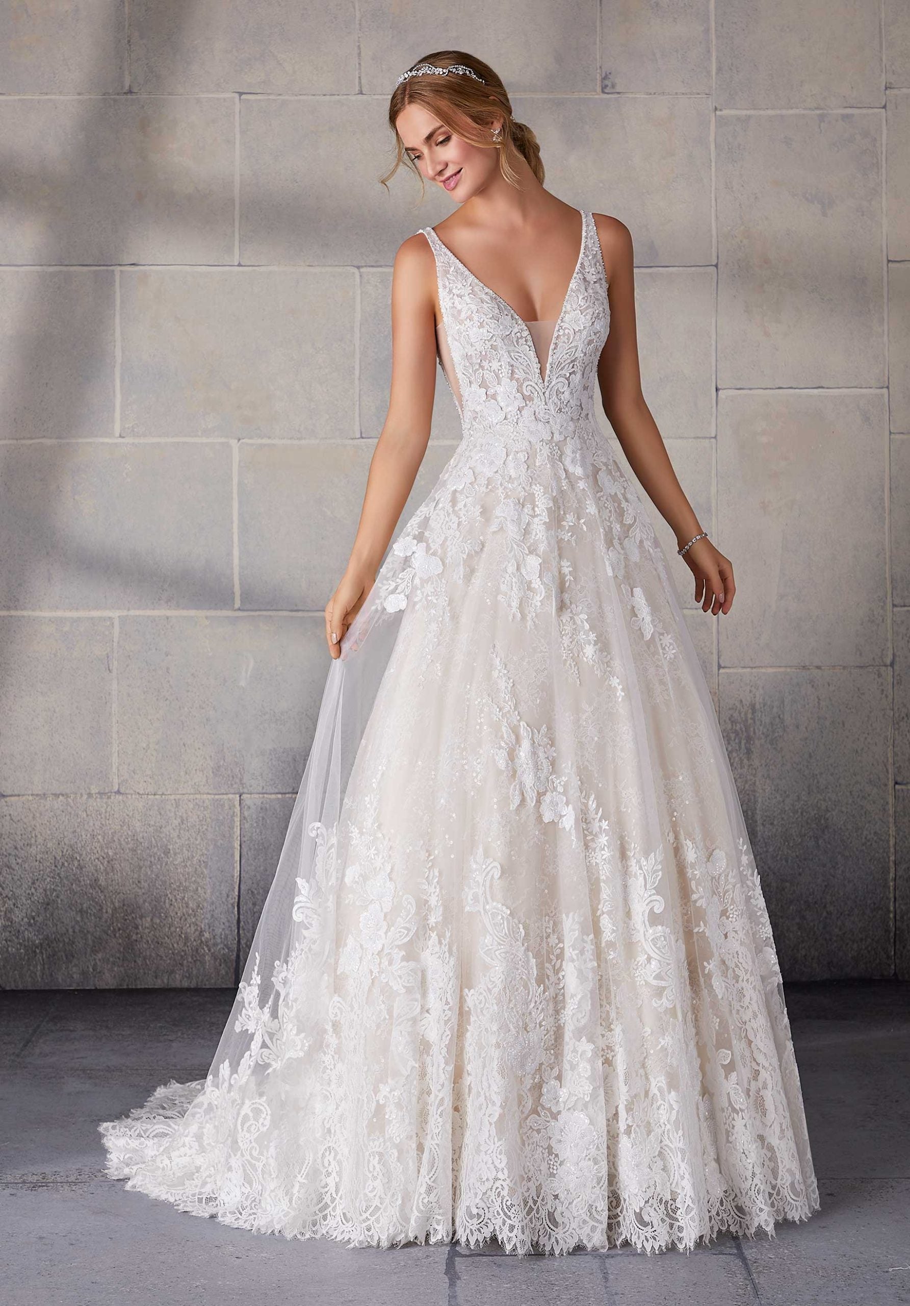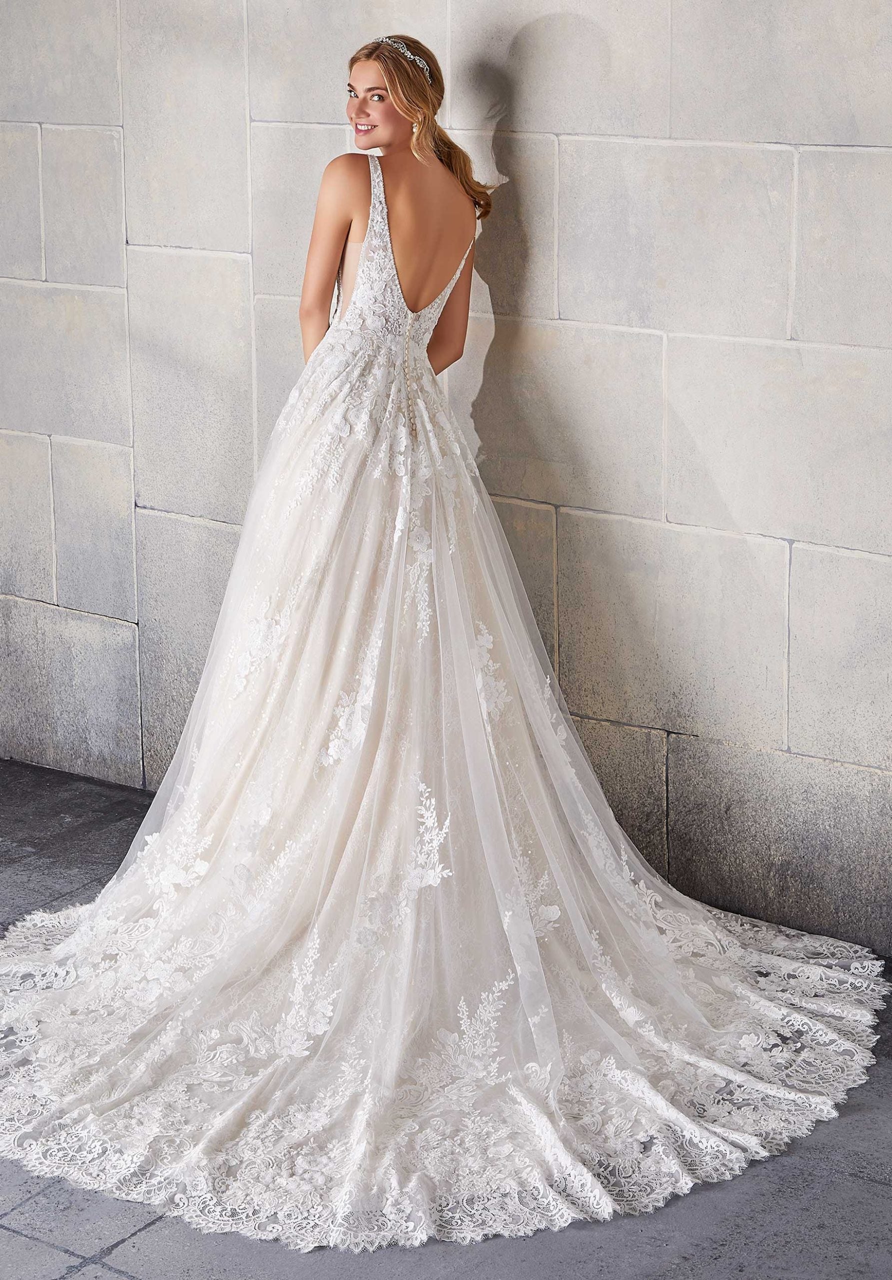 Boho meets luxe in our Suzanne wedding gown. Featuring a diamante and crystal beaded trimmed v-neck bodice, with delicately beaded, embroidered appliqués. A net over sequined chantilly lace ball gown skirt with a wide scalloped hemline completes the look. Available in three lengths: 55″, 58″, 61″. Available with front bodice lining as style 2142L. Show in Ivory/Champagne.